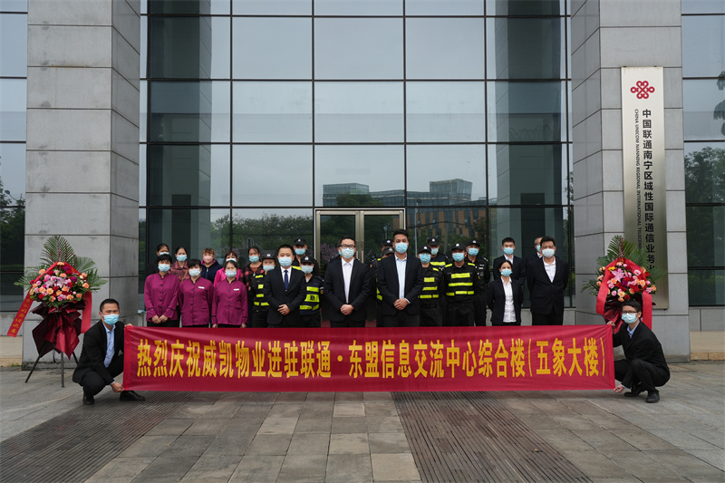 2022年3月31日下午,威凯智慧物业在中国联通广西分公司东盟信息交流中心综合楼(以下简称“中国联通五象大楼”)中庭广场举行了进驻仪式。