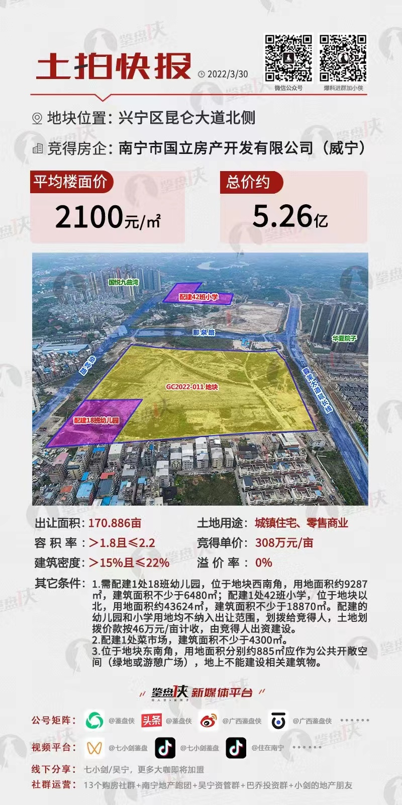 2022年3月30日,C7(中国)房地产公司监管单位国立公司以5.26亿元成功斩获南宁市兴宁区昆仑大道北侧地块,成交单价308万元/亩,楼面价2100元/㎡。