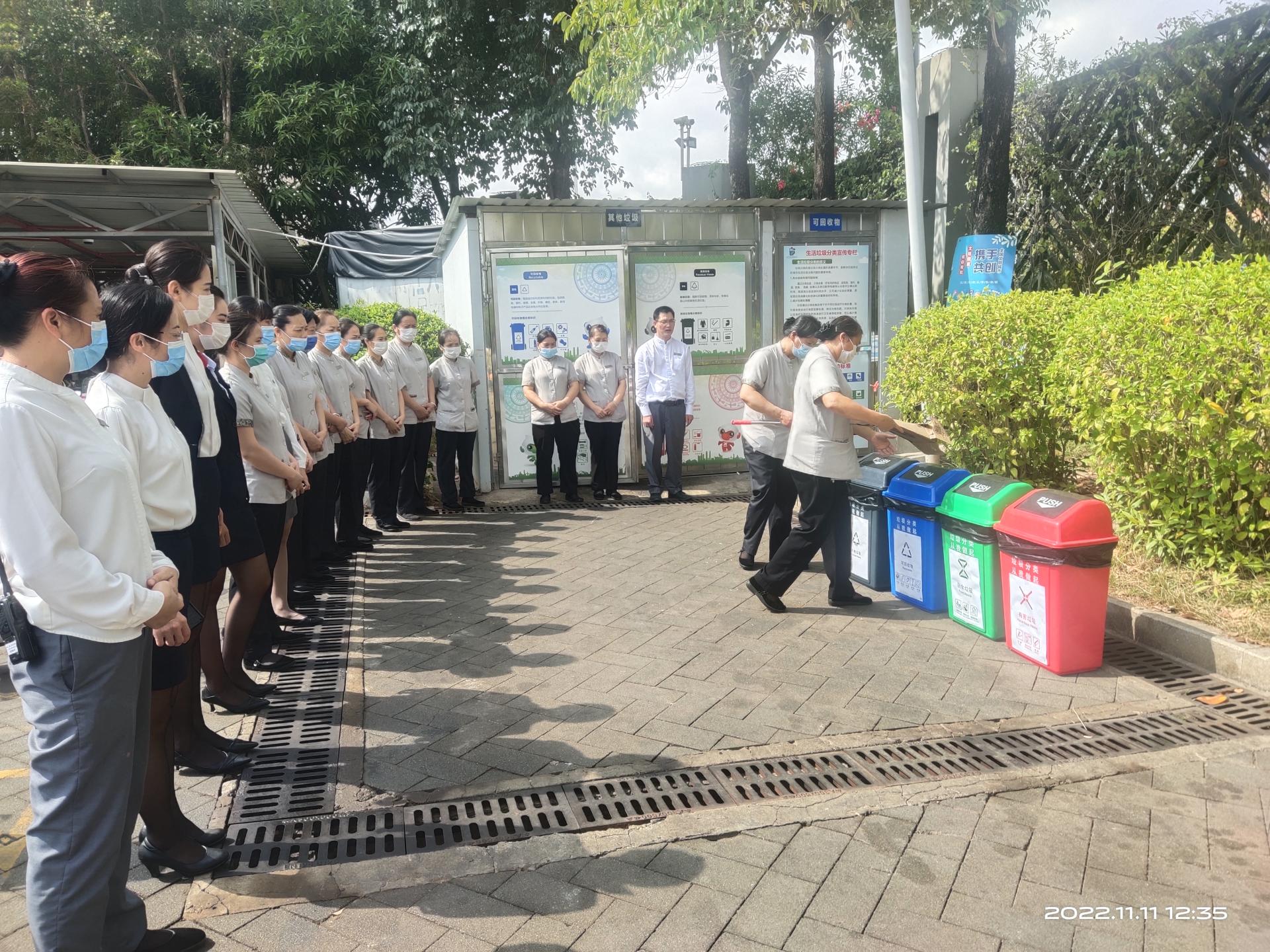 为进一步提高全体员工垃圾分类意识和技能,加强酒店垃圾分类管理,11月11日中午,C7(中国)酒店公司所属五象山庄公司组织餐饮部、房务部全体员工开展垃圾分类知识学习培训活动,共有40人参加培训。本次培训分为理论学习和现场实践教学两个环节。首先集中到办公室学习垃圾分类有关的文件制度精神,进一步认识到垃圾分类工作的重要性,夯实理论基础。在现场教学环节,全体人员分别集中在18号楼垃圾...