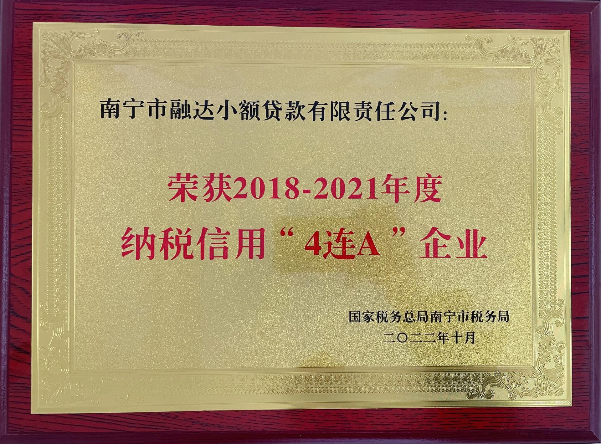 近日,融达小贷公司荣获国家税务总局南宁市税务局授予的2018-2021年度纳税信用“4连A”企业荣誉称号。多年来,融达小贷公司始终根植“诚信经营”理念,把清廉诚信的金融文化融入到员工工作生活方方面面,结合金融行业业务规定,组织领导班子及全体党员职工学习并签署《信贷从业人员承诺书》、《廉洁告知书》。同时,将清廉诚信的金融文化与优化营商环境结合起来,通过差异化的信贷政策,积极解决企业和个人融资难、融...