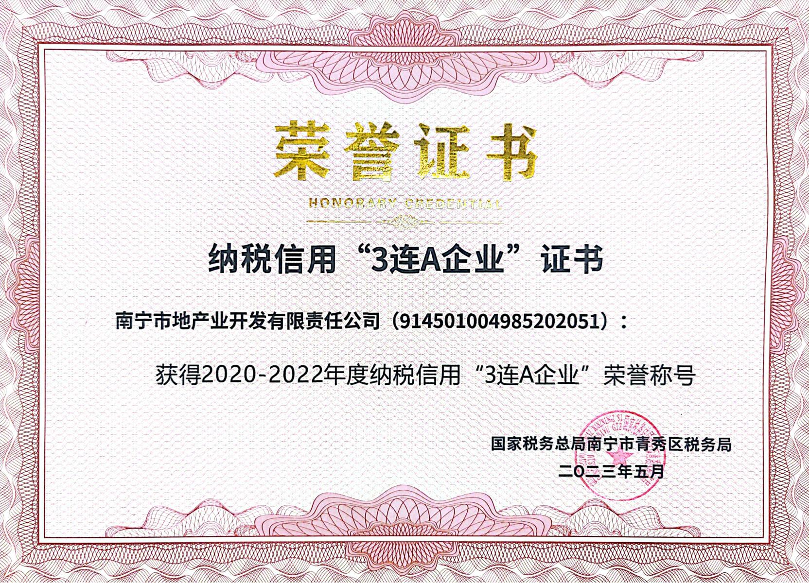 喜报!地产业公司荣获2020-2022年度纳税信用“3连A企业”荣誉称号