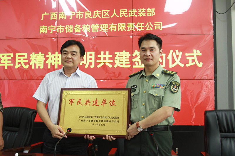2018年5月10日,储备粮公司与广西南宁市良庆区人民武装部举行军民精神文明共建签约仪式,深化军民“鱼水情”,拓宽相互促进,共创精神文明模范单位的新路。
