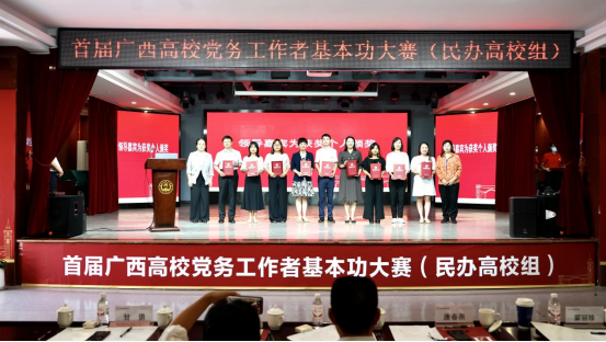 展示现场陈璐(右二)、王静静(右五)获颁一等奖证书2022年9月29-30日,由自治区党委教育工委主办的首届广西高校党务工作者基本功大赛(民办高校组)在广西外国语学院落下帷幕。我校选派的教师党支部书记王静静、学生党支部书记陈璐、专职组织员梁肖杨代表学校参赛。经过激烈角逐,王静静和陈璐分别以所在组别总分第一名的好成绩获得一等奖,梁肖杨获得二等奖。首届广西高校党务工作者基本功大赛(民办高校组)共吸引了来自全...