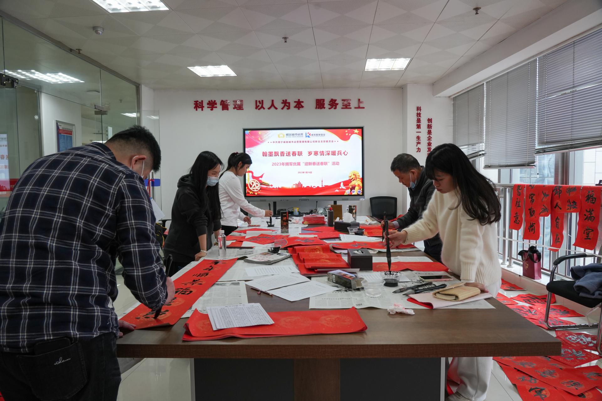 2023年癸卯兔年的脚步越来越近了。为了弘扬中华传统文化,增添公司新年氛围,1月16日威邕城市运营联合党支部、威邕公司工会组织了“墨香写福添喜气 挥毫筑梦新时代”写春联送福主题活动。活动组织公司党员职工、家属现场书写春联,为即将来临的春节增添了浓浓的喜庆氛围。活动现场,书法“达人”们铺开春联纸,沾满墨汁,一笔一画遒劲有力,一幅幅包含寓意的新年祝福跃然纸上。党员、职工有的帮忙铺纸、压...