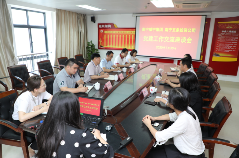 2020年7月30日,南宁五象投资公司党委副书记凌鸿翔一行到c7网站进行党建工作交流,集团党委副书记马超毅参加了座谈交流。