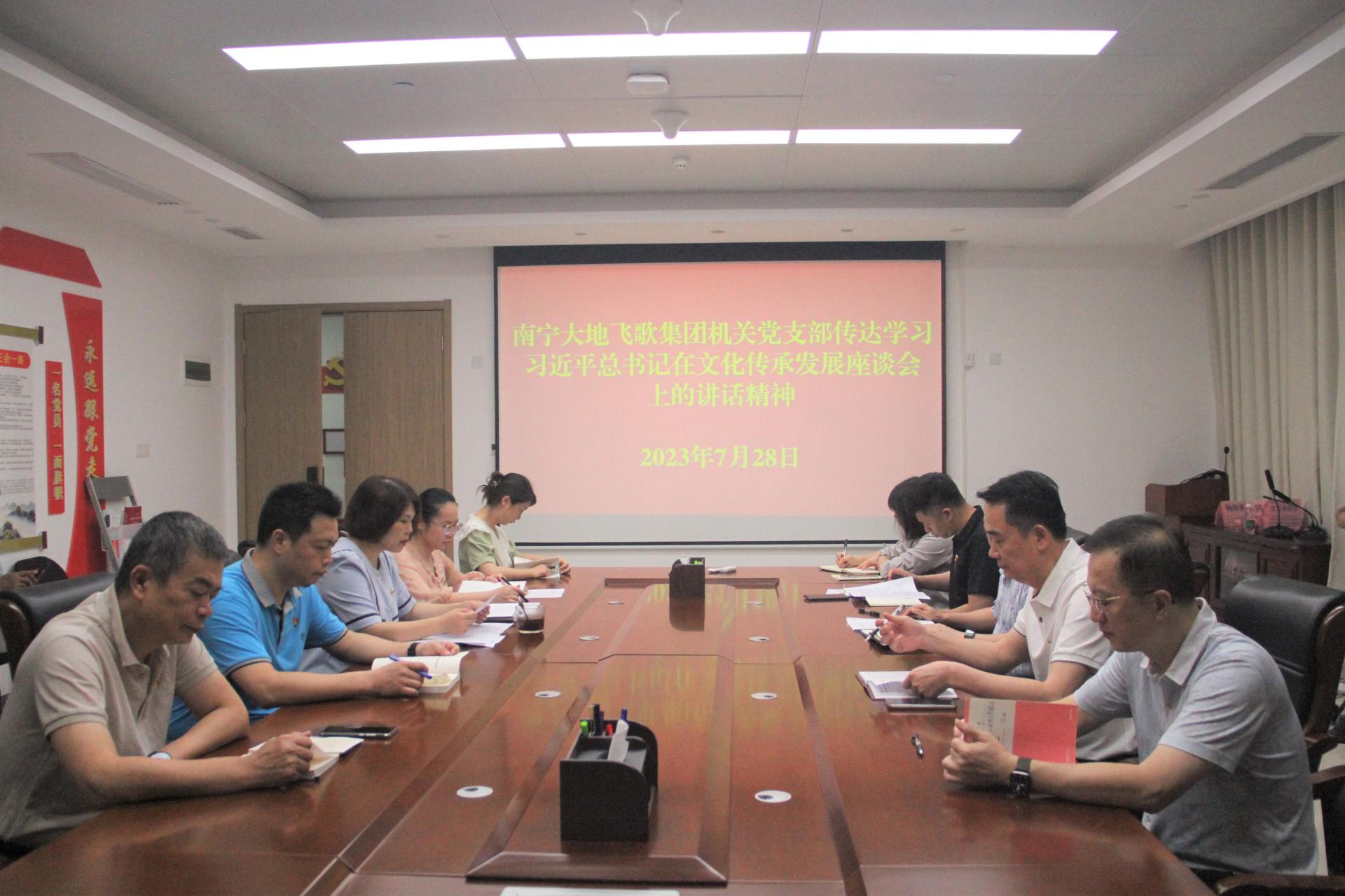 为深入学习贯彻党的二十大精神,扎实推进基层党建“五基三化”提升年行动深入开展,2023年7月28日,南宁大地飞歌集团机关党支部召开党员大会,会议由机关党支部书记杨青林主持。学讲话 扬精神 悟思想。会上,杨青林带领全体党员学习习近平总书记在文化传承发展座谈会上的讲话精神。通过学习党员们一致认为,习近平总书记在文化传承发展座谈会上的重要讲话,着眼于强国建设、民族复兴,立足于赓续中华文脉、建设现代文...