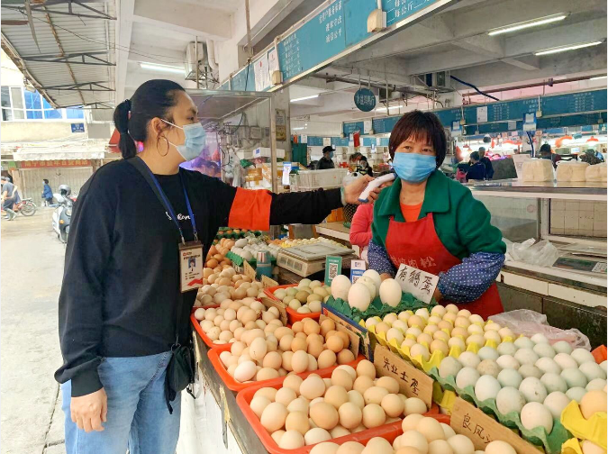 4月27日一早,渐渐恢复喧嚣的津头市场门口,进出的人们稍显忙碌,奔走里外的津头市场员工翁晓丹正逐户记录着经营户的体温信息,紧张的神经虽然还未能放下,但从她与经营户攀谈时放松的神情也能得知,一切都在大家的共同努力下变好。