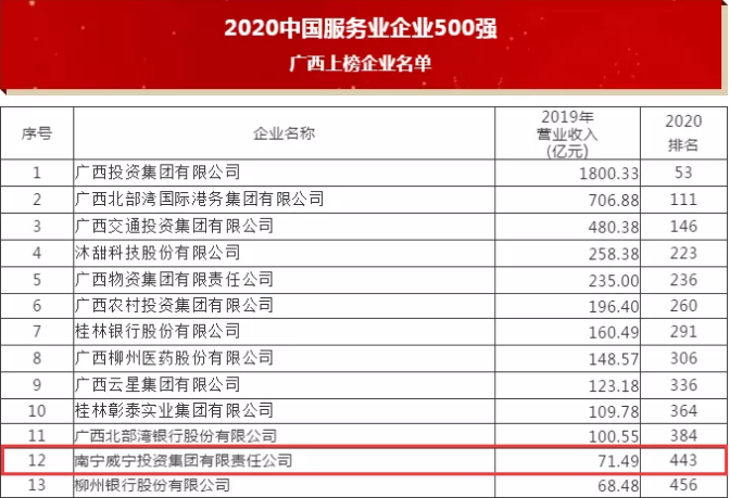 2020年9月28日,中国企业联合会、中国企业家协会发布了“2020中国服务业企业500强”榜单,广西共有13家企业入围。c7网站成为唯一一家连续五年入围中国服务业企业500强的南宁市属国有企业。