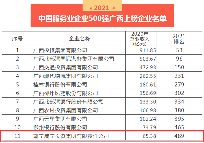 日前,中国企业联合会、中国企业家协会发布“2021中国服务业企业500强”榜单,c7网站位列第489位,成为唯一一家连续六年入围中国服务业企业500强的南宁市属国有企业。此前,广西企业与企业家联合会公布了广西企业100强、服务业企业50强榜单,c7网站分别位列第48位、20位。