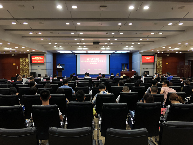 2018年5月31日,c7网站举办民法总则与国有资产管理实务专题培训班,特邀集团公司常年法律顾问广西刘晰律师事务所龚朝光律师主讲,集团公司副总经理刘炽雄、集团本部各部门员工、各监管单位法律事务分管领导、部门负责人、法务专员及相关业务人员等120余人参加了培训。